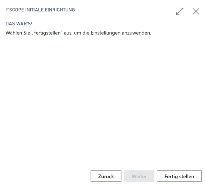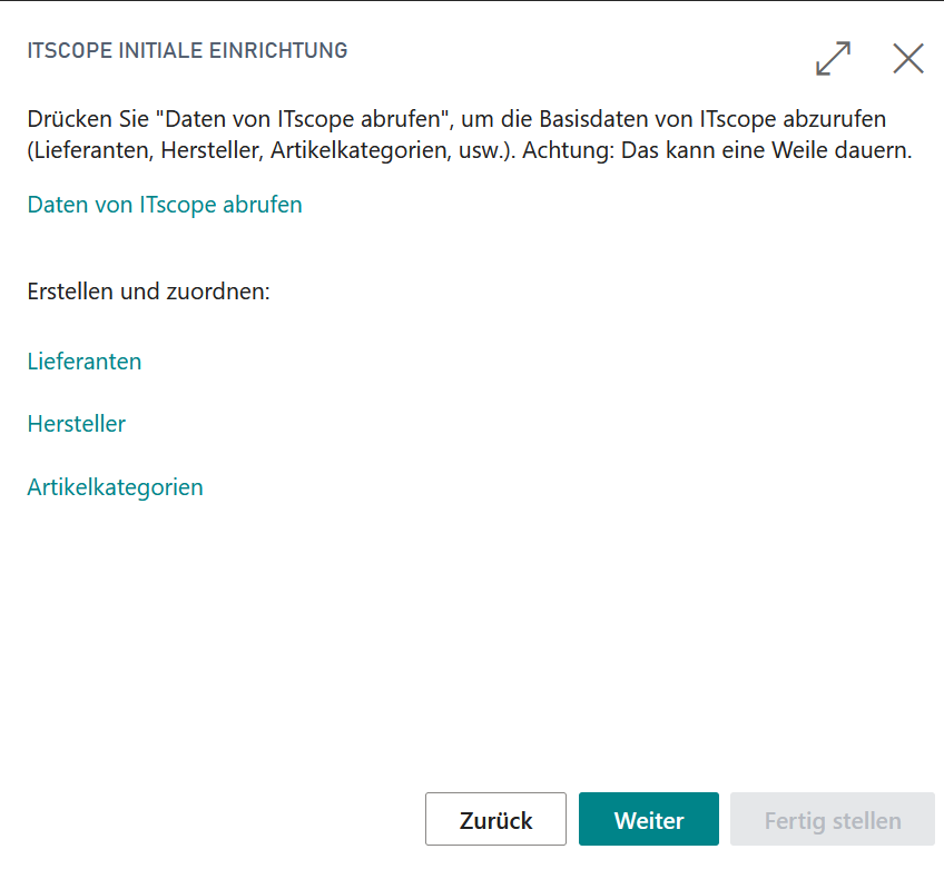 | Daten von ITscope abrufen | Die ITscope Daten (Lieferanten, Hersteller und Artikelkategorien) werden abgerufen und in Ihrem System gespeichert. Diese Funktion konnte einige Zeit in Anspruch nehmen. |