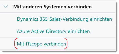 Das ITscope Modul unterstützt Sie bei der einmaligen Initialen Einrichtung. Sie erreichen die Unterstütze Einrichtung über das Zahnradsymbol in der rechten oberen Ecke. Wählen Sie in der Auflistung den Menüpunkt „Mit ITscope verbinden“, um die Einrichtung zu starten.